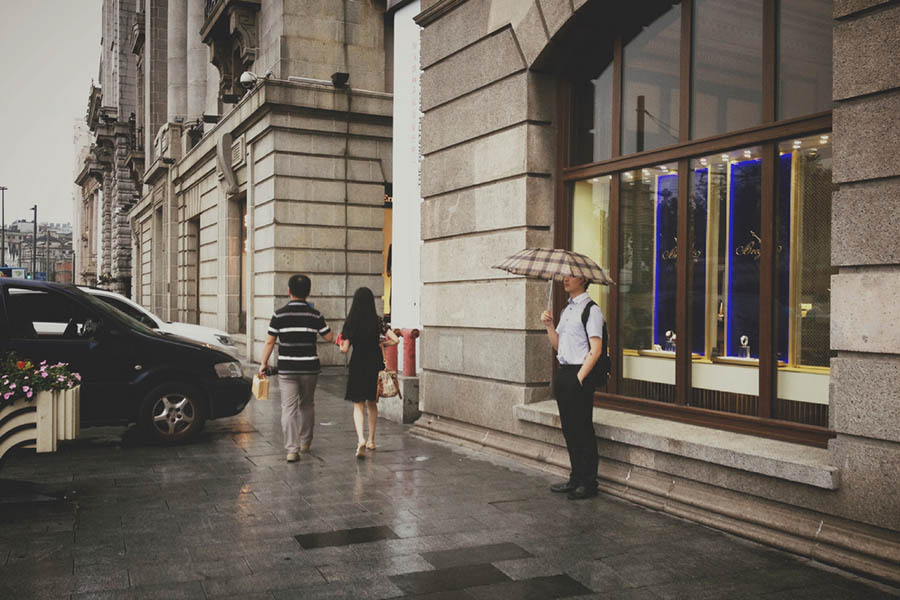 下雨天里撑伞漫步的人